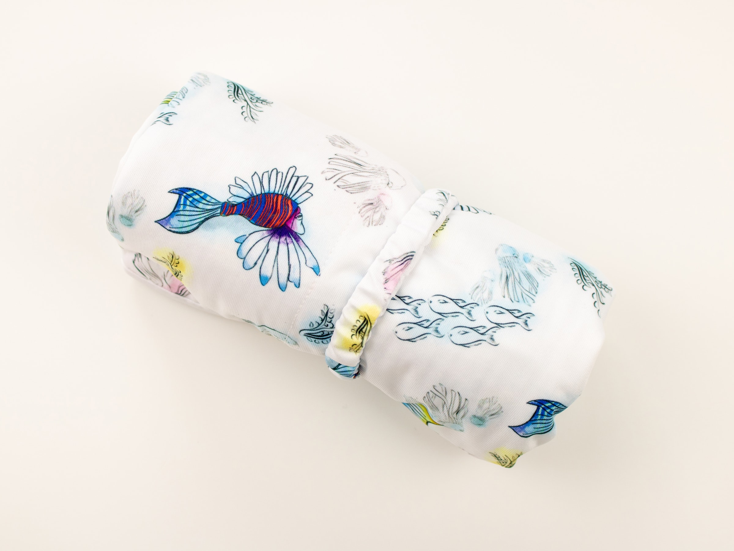 Die soulely mat lässt sich einfach zusammenrollen und dann durch das angenähte Gummiband schließen. So findet sie gut verstaut in jeder Wickeltasche Platz.